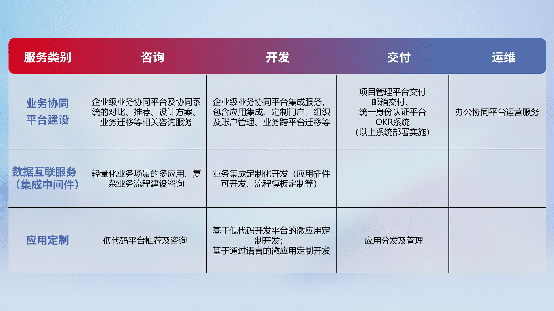 针对钉钉、、、企微、、IDaas等平台级产品提供产品的规划、、方案、、、交付、、、、定制化开发等服务,,,实现如统一协同办公、、、、智能客户服务、、、、混合会议管理、、智能数据查询、、等业务场景,,,,实现数字化转型。。